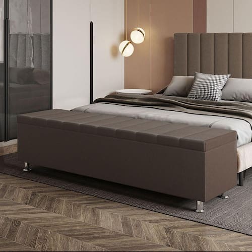 Além de seu assento aconchegante, o recamier estofado com baú conta com amplo espaço interno para armazenar roupas de cama, mantas ou acessórios, ajudando na organização do ambiente. Sua estrutura resistente e estofamento macio garantem durabilidade e conforto no uso diário.
