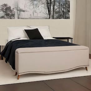 CARACTERISTICAS DO PRODUTO: Material da Estrutura: Madeira de eucalipto Material e Densidade da Espuma: Poliuretano sem carga Revestimento: Linho Tipo de Pe: Em madeira chanfrado de 10,5 cm Possui Frame: Nao Pistoes no Bau: Sim