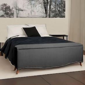 CARACTERISTICAS DO PRODUTO: Material da Estrutura: Madeira de eucalipto Material e Densidade da Espuma: Poliuretano sem carga Revestimento: Veludo Tipo de Pe: Em madeira chanfrado de 10,5 cm Possui Frame: Nao Pistoes no Bau: Sim