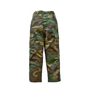 As calças juvenis clássicas BDU/M81 Woodland Camo apresentam calças de 6 bolsos com bolsos laterais. A cintura tem presilhas. Feito com ripstop durável de 6,5 onças e construído para durar.