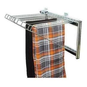 Calceiro TT MAX Produto confeccionado em aço carbono, com estrutura tubular. Contém 12 varetas aramadas. Acompanha trilhos telescópicos, que vão montados na peça. Acompanha também distanciadores metálicos. Para uso dentro de armários. Tem o acabamento cromado e capacidade para 1 calça por vareta, ou 6 Kg. Medidas totais: 430x315x430mm Código: 8037 Garantia: 12 Meses
