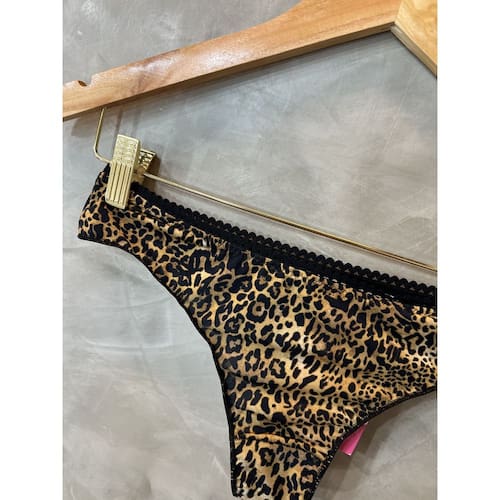 Calcinha fio dental em onça com detalhe em renda sem costura. Para as apaixonadas por detalhes a renda macia no cós e nas cavas das pernas traz um toque delicado e deixa esta peça com um diferencial incrível. O flower sofisiticado alia conforto em uma só proposta!