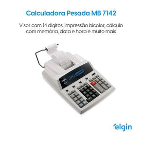A calculadora MB 7142 da Elgin dispõe de 14 dígitos, permitindo operações precisas. Também possui funcionalidades como duplo e triplo zero, calendário e relógio, além da capacidade de imprimir datas. Sua voltagem é bivolt automático, e o visor é fluorescente. A calculadora é alimentada por energia e oferece funções como cálculo de taxas, GT, MU, raiz quadrada, delta percentual, constante e porcentagem. Também inclui recursos como contador de itens, seletor de arredondamento e decimais, e inversão de sinais.