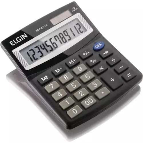 Calculadora De Mesa Mv-4124 12 Dígitos Detalhes Calculadora de mesa com 12 dígitos; Visor: Cristal líquido; Funções: Porcentagem, raiz quadrada, memória, Inversão de sinais; Desligamento automático ou tecla OFF; Alimentação: Solar ou bateria G-10; Dimensão: 128 x 143 x 26 mm.