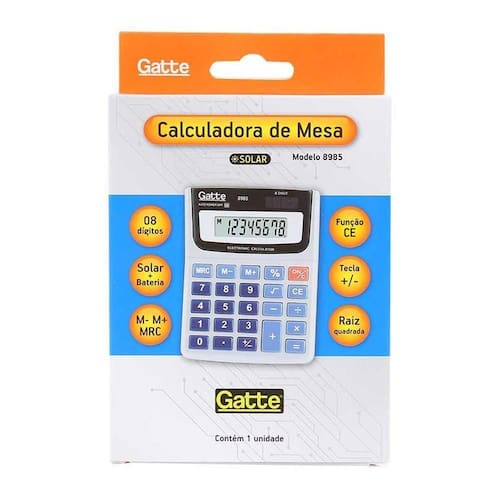 Perfeita para quem busca praticidade no seu dia a dia essa calculadora é um dispositivo eletrônico compacto, projetado para realizar operações matemáticas básicas, como adição, subtração, multiplicação e divisão, bem como funções mais avançadas, como raiz quadrada e porcentagem. Este tipo de calculadora foi fabricado com material de alta qualidade, o que a torna uma ferramenta conveniente para estudantes, profissionais e qualquer pessoa que precise de cálculos rápidos e básicos durante o dia. Calculadora grande 8 dígitos bateria + solar 12,6x9,7x3,1cm gatte 8985, oferece o melhor para os amantes de números atenção: imagem meramente ilustrativa. Pode ocorrer mudanças no tom da cor para o produto real ou mudanças na embalagem sem aviso prévio por parte do fornecedor/fabricante. - atenção não recomendável para crianças menores de 3 três anos por conter parte s pequena s que pode m ser engolida s ou aspirada s e ponta s aguda s funcional is . Marca: Não Informado Ean: 7897771601917