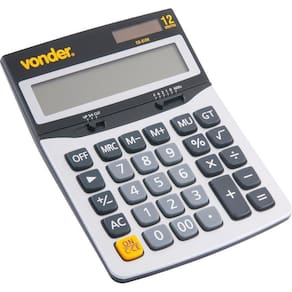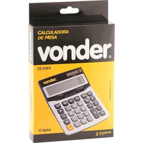 Conteúdo da embalagem1 CalculadoraAplicações e dicas de usoIndicada para cálculos em geral DETALHES TÉCNICOS Capacidade de dígitos do visor da calculadora de mesa: 12 dígitos--------------------- BIG BOOST ------------------------Calculadora De Mesa 12 Dígitos Cs 312Vii - VonderCalculadora de Mesa 12 Dígitos Cs 312vii - Vonder Não necessita de pilhas, possui célula solar.. Indicada para cálculos em geral. Dados Técnicos Capacidade de dígitos do visor da calculadora de mesa: 12 dígitos Indicação: Casa, Lazer e Utilidades