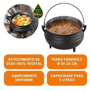 Fabricada em ferro fundido resistente, é um utensílio durável e versátil, que pode acompanhar a rotina da cozinha por muitos anos quando bem conservado. Ideal para o preparo de ensopados, caldos e receitas de cozimento lento, podendo ser utilizada em fogões a lenha, carvão e gás.