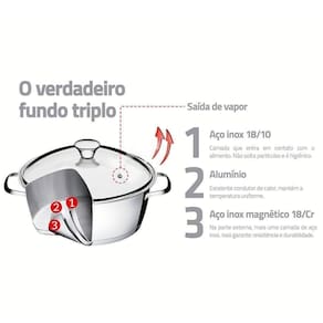 - Perfeito para diferentes receitas, ele é produzido em aço inox com fundo triplo (aço inox + alumínio + aço inox), característica que distribui o calor de forma uniforme, proporcionando um cozimento mais rápido e deixando os alimentos aquecidos por mais tempo, além de economizar mais energia.