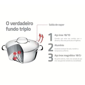 - Economiza tempo e energia: o segredo está no fundo triplo (aço inox + alumínio + aço inox), que distribui o calor uniformemente, proporcionando um cozimento mais rápido.