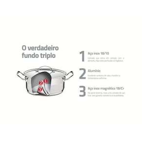 Totalmente feita de aço inox, não solta nenhum resíduo nos alimentos, mantendo-os saudáveis. Seu desenho limpo e sem cantos torna a limpeza muito mais fácil. O fundo triplo (aço inox + alumínio + aço inox) distribui o calor uniformemente, proporcionando um cozimento mais rápido e uniforme, economizando energia e deixando os alimentos aquecidos por mais tempo. Cabos e alças fixados por solda-ponto, com maior reforço. Alças longas e cabos tubulares em aço inox para manuseio . Acabamento com faixa satinada e alto brilho. Pode ser utilizada nos fogões: gás, elétrico, vitrocerâmico e indução.