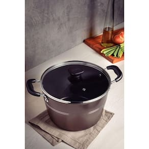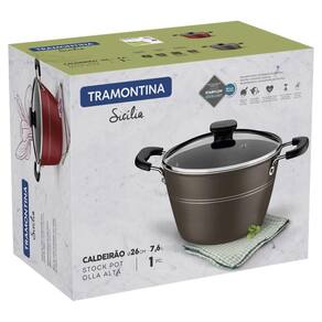 Prepare caldos, cremes e sopas com muito mais facilidade, utilizando o caldeirão Tramontina Sicília em alumínio com revestimento interno e externo em antiaderente Starflon Excellent avelã com tampa de vidro 26 centímetros de diâmetro 7,6 litros. Ideal para preparar receitas em maior quantidade, ele é produzido em alumínio e conta com espessura de 3 milímetros, o que garante um cozimento rápido e uniforme dos alimentos. Seu revestimento interno e externo é em antiaderente Starflon Excellent, característica que evita que os alimentos grudem em sua superfície, o torna fácil de limpar, mais durável e não prejudicial a sua saúde. Ele vem com tampa de vidro temperado com saída de vapor, tem alças e pegador em baquelite antitérmico que não aquecem e proporcionam um manuseio mais seguro e confortável. Além de todas essas características, o caldeirão pode ser lavado na máquina de lavar louças e vai deixar seu dia a dia muito mais prático!