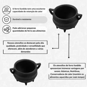 Caldeirão Tripé Miniatura Ferro Panela Mineira 6x5,5cm 100ml O Caldeirão Tripé Miniatura da Panela Mineira faz parte das réplicas que desenvolvemos de algumas panelas tradicionais da nossa marca. Com design tradicional e, ao mesmo tempo, autêntico, encanta qualquer apresentação, seja para servir porções individuais de acompanhamentos ou simplesmente decorar. Orientação de Uso e Conservação:Antes do primeiro uso: Lave com água e sabão, seque bem com um pano. Já vem pronta para uso, então não precisa ser curada. Após cada uso: Lave com água e sabão, usando uma esponja ou escova para remover todos os resíduos de alimentos. Se restarem resíduos, ferva água com um pouco de detergente para soltá-los. Pintura: Revestimento atóxico que garante durabilidade e proteção prolongada, sem causar nenhum dano à saúde. Características Técnicas e Medidas: Linha: Bares e Restaurantes.Material: Ferro Fundido.Modelo: Miniatura.Litragem: 100ml.Diâmetro: 6cm.Peso: 0,350Kg.Altura: 5,5cm. Itens Inclusos: 01 Caldeirão Tripé Miniatura Ferro Panela Mineira 6x5,5cm 100ml. Código: 1306PMProdutoLojaPlast.