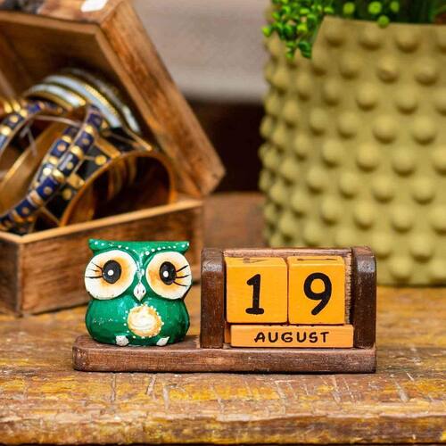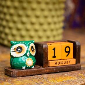 Calendário Coruja Verde de Madeira Balsa Importado de Bali Calendário Coruja Verde de Madeira Balsa Importado de Bali