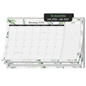 Este calendário oferece uma visão geral mensal das tarefas e eventos e vai de janeiro de 2026 a janeiro de 2027. Há muito espaço para anotações, pautado para uma escrita fácil e organizada. Os feriados federais são destacados em vermelho.