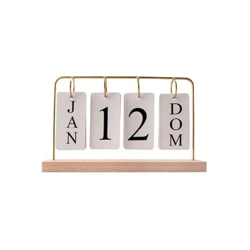 Calendário de mesa decorativo permanente base de madeira aramado dourado Atenção: o calendário é permanente A troca de data é feita manualmente As fichas com numeros dias da semana e meses são frente e verso