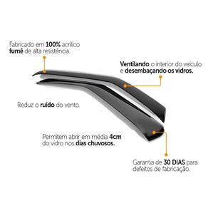 Especificação Técnica: - 100% Acrílico - Modelo específico do veículo - Tamanho padrão de fábrica - Cor Fumê - Reduz ruídos do vento - Permite abrir em média 4cm do vidro em dias chuvosos - Possui sistema de fixação por fita 3M - Acompanha 1 Primer para limpeza