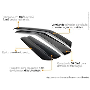 Com nossas calhas mesmo em dias chuvosos nos permitem de abrir as janelas de 4cm a 6cm dependendo do nível da chuva, e reduzindo os ruídos dos ventos quando a janela estiver aberta dando a possibilidade de ventilar o carro. Modelo: Calha de chuva para chevrolet s10 cabine dupla 2012 a 2020 4 portas. Especificação técnica: - 100% acrílico - modelo específico do veículo - tamanho padrão de fábrica - cor fumê - reduz ruídos do vento - permite abrir em média 4cm do vidro em dias chuvosos - possui sistema de fixação por fita 3m - acompanha 1 primer para limpeza Itens inclusos: - 1 conjunto de calha de chuva. - 1 primer para limpeza Dimensões Tamanho padrão conforme as especificações da montadora. Instalação A instalação é feita de forma simples, podendo ser feita por você mesmo. de 30 dias para defeitos de fabricação. Marca: Não Informado Ean: 7897452688244