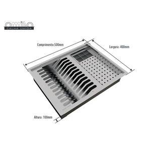 Dimensões: 500 x 400 x 100 mm (CxLxA) Dimensões para recorte no tampo: 480 x 380 mm (CxL)
