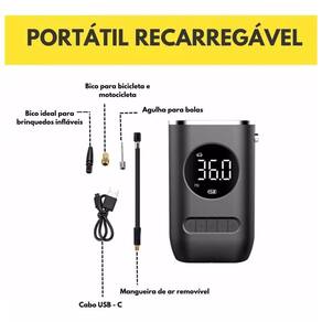 Calibrador Compressor Pneu Digital Sem Fio: Mobilidade para Carro e Bicicleta Compressor Portátil com bateria interna de 2000mah Recarregável, com visor digital . 1 - Sem fio, não necessita de conexão ao acendedor de . 2 - Compacto - Cerca de Altura 13,7 cm X Largura 8,9 cm, O tamanho é equivalente a um Smartphone com tela de 4,7, podendo caber facilmente no porta luvas, na moto ou em sua mochila. 3 - Leve - Peso de cerca de 395 gramas. 4 - Possui uma pequena lanterna para operação em locais de baixa iluminação. 5 - Interface de carregamento via cabo USB - Type C , mais rápido que os tradicionais incluso no kit . 6 - Acompanha bico para pneu com rosca sem perigo de soltar como as de alavanca , bico de pneu rápido, bico para bola, 2 bicos para infláveis e cabo de carregamento. OBS: Pausar por 5 minutos depois de usar por 10 minutos. Caso contrário, a temperatura crescente do escudo de metal danificará o motor. Especificação: Material: ABS 10A Tensão: 7,4V Potência: 50W Fluxo de ar: 25L / min Tipo de fonte de alimentação: TYPE-C Comprimento do cabo de alimentação: 0,8 metros Comprimento do tubo inflável: 0,5 Marca: Não Informado