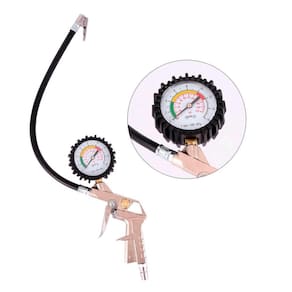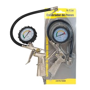 Calibrador e Inflador com Manômetro Mangueira Flexível Bico com Presilha Fácil Operação Fabricado em Liga de Alta Qualidade Produz Agilidade na Hora do Trabalho Encaixe de Rosca de 1 / 4 NPT Manômetro Para Monitoramento de Pressão Pressão de Trabalho 220 PSI/16BAR
