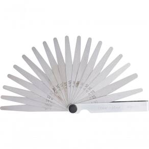 1 Cálibre de folga, composto por 20 lâminas: 0,05 mm - 0,10 mm - 0,15 mm - 0,20 mm - 0,25 mm - 0,30 mm - 0,35 mm - 0,40 mm - 0,45 mm - 0,50 mm - 0,55 mm - 0,60 mm - 0,65 mm - 0,70 mm - 0,75 mm - 0,80 mm - 0,85 mm - 0,90 mm - 0,95 mm e 1,00 mm