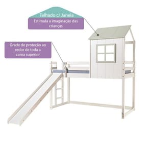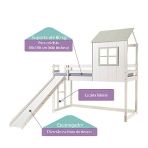 Acompanha Colchão: Não Altura do Conjunto: 211 cm Ambiente: null Ambiente Principal: Quarto Infantil Cor: Branco/Verde Informação Complementar: 1x Cama Alta Infantil Cabana Family Branco/VerdeLargura: 206 cmAltura: 211 cmPeso: 45 kgProfundidade: 110 cmNecessita Montagem: Sim1x Escorregador Para Cama Alta Cabana Family BrancoLargura: 33,5 cmAltura: 9 cmPeso: 11 kgProfundidade: 182,5 cmNecessita Montagem: Sim Material Principal: Madeira Maciça Permite a Utilização de Cama Auxiliar: Não Possui Portas: Não Suporta Até (kg): 80 kg