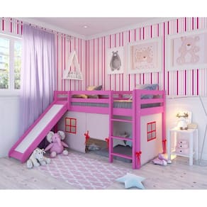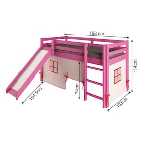 Cama Alta Kids com Escorregador e Tenda em Madeira Maciça/MDF Rosa. A Cama Alta Kids com Escorregador e Tenda transforma o quarto do seu filho(a) em um local de alegria e diversão. Cama de qualidade produzida com madeira maciça de Pinus de reflorestamento e com algumas partes em MDF, além de ter um acabamento em Laca. A escada e o escorregador são reversíveis, ou seja, podem ser montados nos dois lados (direito e esquerdo) da cama. O escorregador vem com dois ganchos de metal para encaixe na barra lateral da cama e é de fácil remoção. A tenda é produzida de tecido e nas cores que melhor combinam com o produto e que dão encantamento ao quarto. Recomendações de Uso, Manutenção e Limpeza: Não armazenar ou utilizar o produto em locais com excesso de umidade. Para limpeza, não utilizar produtos químicos e abrasivos, usar apenas com pano umedecido, para garantir a maior durabilidade do móvel. Seguir rigorosamente as instruções de uso contidas no Manual de Montagem. Marca: Arbol Móveis