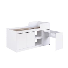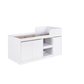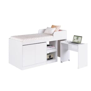 A cama alta multifuncional solteiro com estação de trabalho CJ6080 possui estrutura em MDP 15mm e acabamento FF fosco. Possui montagem opcional direita/esquerda, protetor antiqueda com canto arredondado e perfil T. A cama suporta até 110kg e a mesa até 20kg. A escrivaninha possui rodízios plásticos e 1 gaveta com corrediça metálica e que suporta 5kg. A cama conta também com 1 prateleira/degrau que suporta até 50kg, 1 nicho que suporta 5kg e 2 portas de bater com dobradiça metálica e uma prateleira interna que suporta 5kgs. O material do estrado é eucalipto/MDP, sendo que a altura do estrado até o chão é de 103cm. Medida máxima do colchão indicado: SOLTEIRO: 78cm x 188cm. Não necessita fixar na parede. Conteúdo da embalagem: móvel, ferragens e manual de montagem. A fixação das peças e/ou acessórios é feita por parafusos, cavilhas e minifix. Para uma limpeza mais efetiva, utilizar apenas pano macio umedecido e sabão neutro. Não utilizar produtos abrasivos. Garantia de 03 meses contra defeitos de fabricação. Medidas do produto (AxLxP): 108,8x192x82cm. Peso do produto:78,1kg. Não acompanha colchão.