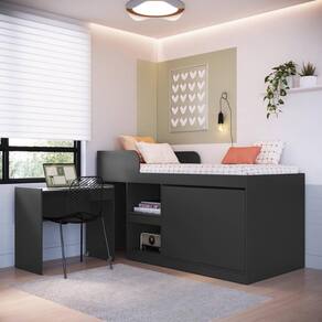 A cama alta multifuncional solteiro com estação de trabalho CJ6080 possui estrutura em MDP 15mm e acabamento FF fosco. Possui montagem opcional direita/esquerda, protetor antiqueda com canto arredondado e perfil T. A cama suporta até 110kg e a mesa até 20kg. A escrivaninha possui rodízios plásticos e 1 gaveta com corrediça metálica e que suporta 5kg. A cama conta também com 1 prateleira/degrau que suporta até 50kg, 1 nicho que suporta 5kg e 2 portas de bater com dobradiça metálica e uma prateleira interna que suporta 5kg. O material do estrado é eucalipto/MDP, sendo que a altura do estrado até o chão é de 103cm. Medida máxima do colchão indicado: SOLTEIRO: 78cm x 188cm. Não necessita fixar na parede. Conteúdo da embalagem: móvel, ferragens e manual de montagem. A fixação das peças e/ou acessórios é feita por parafusos, cavilhas e minifix. Para uma limpeza mais efetiva, utilizar apenas pano macio umedecido e sabão neutro. Não utilizar produtos abrasivos. Garantia de 03 meses contra defeitos de fabricação. Medidas do produto (AxLxP): 108,8x192x82cm. Peso do produto:78,1kg. Não acompanha colchão.