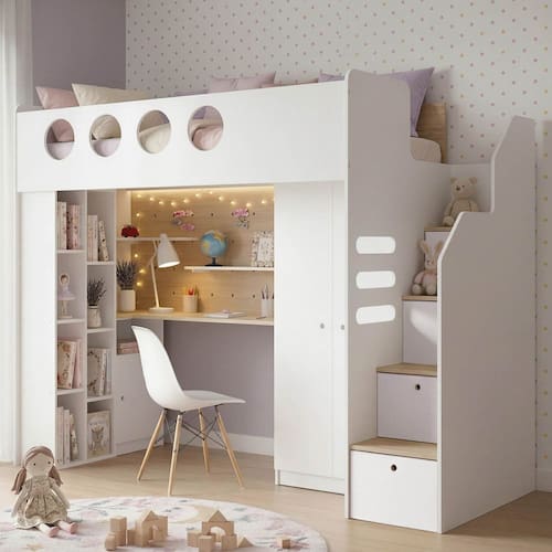 Recuros: Escada baú, escrivaninha, nicho vertical, painel com 2 prateleiras e guarda roupa