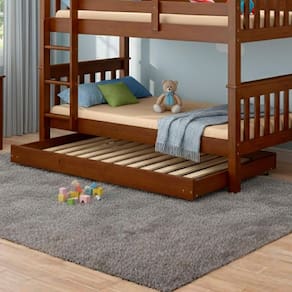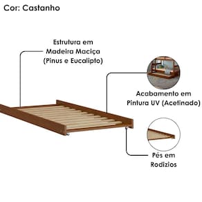Cama Auxiliar Solteiro 715EA com um design moderno e funcional perfeita para complementar seu ambiente de quarto! Com estrutura 100% em Madeira Maciça de Pinus (sendo os lastros em Madeira de Eucalipto) e acabamento UV Acetinado. Composta por Laterais reforçadas e pés em rodizio, suportando até 100kg, ideal e indicada para colchões de 188x88 cm. NÃO ACOMPANHA COLCHÃO NEM DEMAIS DECORAÇÕES. Produto será entregue em 1 volume.