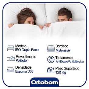 O Colchão Ortobom Colchão Iso Duplo Conforto é a novidade da Ortobom entre os colchões mistos. De um lado possui o seu lado macio com suporte e camada de conforto em espuma D28 Pró Aditivada de Alta Performance, Ideal para pessoas com até 80 quilos. Do outro lado possui o seu lado firme com suporte e camada de conforto em espuma D33 Pró Aditivada de Alta Performance, Ideal para pessoas com até 100 quilos. O tampo é bordado em Matelassê, que entrega uma camada extra de conforto. Seu revestimento é em Poliéster com tratamento antialérgico e antiácaro.
