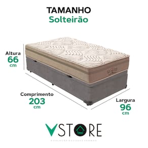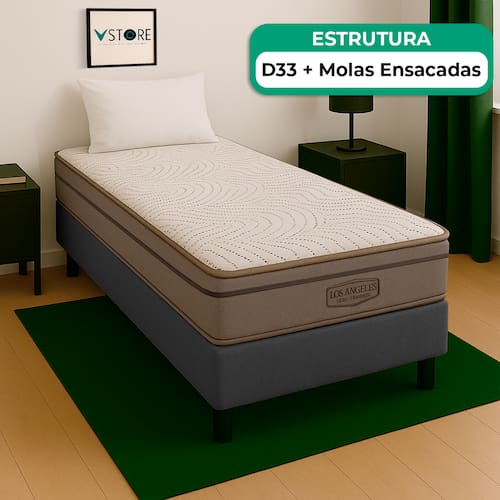 A tecnologia que a sua casa merece está na V-Store! O Conjunto Colchão Los Angeles + Base Box Baú Bravus da V-Store oferece conforto e funcionalidade. O colchão, com molas ensacadas e sistema EPS, garante suporte ideal, conforto térmico e proteção antiácaro. A base box, com amplo espaço de armazenamento, é feita de madeira reflorestada e revestida com tecido resistente, proporcionando praticidade e sofisticação ao seu quarto.Característica Do Colchão: Modelo: Los AngelesMarca: V-StoreTamanho: SolteirãoDimensões: 96x28x203 (Largura x Altura x Comprimento)Conforto: MédioSistema: Molas EnsacadasPillow: Não se aplicaPeso Máximo recomendado: 150 kg (Por pessoa)Proteções: Antiácaro, antialérgico, antifungo, antimofoGarantia: 12 Meses (Espuma) / 10 anos ( Conjunto de Molas Ensacadas)Característica Da Base: Marca: V-StoreModelo: BravusCor do Box: CinzaTamanho: SolteirãoDimensões: 96x44x203 (Largura x Altura x Comprimento)Estrutura: MadeiraPeso máximo recomendado: 150 kg (Por Pessoa)Altura do Box: 38 cmAltura dos Pés: 6 cmAltura total: 44 cmGarantia: 12 Meses (Estrutura) / 3 meses (Tecido)Selo Ecologicamente CorretoAtenção:- Antes de finalizar sua compra, recomendamos que verifique se as dimensões do produto são adequadas para serem transportadas pelos elevadores, portas, escadas e corredores de sua residência. Ressaltamos que não nos responsabilizamos pelo transporte do produto por meios específicos, como escadas, guinchos ou içamentos.- É possível que hajam leves variações de cor de acordo com o dispositivo que está sendo utilizado como smartphones, computadores, monitores e outros.