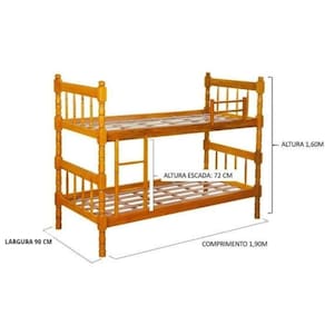 Cor: Mel | Marca: Rubin Móveis | Suporta Até (kg): 90kg cada cama | Possui Pés: Não | Possui Gavetas: Não | Necessita Montagem: Sim | Material: Madeira maciça de eucalipto | Acabamento: Pintura verniz poliuretano brilhante | Altura (cm): 160 | Largura (cm): 90 | Profundidade (cm): 190 | Tipo de Cama: Beliche | Tamanho do Colchão: Solteiro | Tamanho da Cama: Solteiro | Tamanho do Colchão (LxC): 0,88 x 1,88 | Acompanha Colchão: Não | Garantia: 90 dias