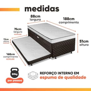 Importante sobre a : A é realizada até a portaria ou porta de entrada do indicado, desde que o acesso seja permitido. Para locais com portaria, a será feita no piso térreo. Não realizamos montagem, desmontagem, por escadas ou içamento. É responsabilidade do cliente verificar se as dimensões do produto são compatíveis com portas, elevadores e corredores. Evite imprevistos: confira todos os detalhes antes de concluir sua compra. MEDIDA TOTAL DO PRODUTO:: [ A ] = 51 cm / 44 cm ( Sem Pés ) [ L ] = 88 cm [ P ] = 188 cm | MEDIDA DA CAMA AUXILIAR:: [ A ] = 17 cm / 10 cm ( Sem Pés ) [ L ] = 75 cm [ P ] = 168 cm | MEDIDA INTERNA DO BAÚ:: [ A ] = 15 cm [ L ] = 74 cm [ P ] = 174 cm | ALTURA DOS PÉS:: 7 cm | PESO:: 53,8 Kg | PESO SUPORTADO:: 80Kg | MODELO:: Cama Bibox com Baú Solteiro Ortopédica com Cama Auxiliar Conjugada 88x188x51cm Gabi | MARCA:: Somopar | REVESTIMENTO SUPERIOR E LATERAL:: Acabamento em tecido poliéster de alta qualidade, com bordado nas laterais que adiciona um toque de sofisticação e elegância ao design. | REVESTIMENTO INTERNO:: Camada de espuma D28 dentro dos padrões ABNT, de alta qualidade, com suporte ortopédico que garante firmeza e conforto na medida certa, suportando até 80 kg por pessoa. | EURO PILLOW:: Sim, acabamento sofisticado que traz um toque extra de maciez, elegância e conforto premium para suas noites de sono. | MATERIAL DA ESTRUTURA:: Produzida em madeira de eucalipto de alta resistência, garantindo durabilidade, firmeza e suporte por muito mais tempo. | MATERIAL DO PISTÃO:: Molas | MATERIAL DOS PÉS:: PVC | QUANTIDADE DE PÉS:: 8 | DIFERENCIAL:: 4 em 1 | ITENS INCLUSO:: 1 Cama box baú conjugada Solteiro com 1 Cama auxiliar Solteiro | GARANTIA:: 3 Meses Pelo Fabricante | AVISO:: Importante sobre a : A é realizada até a portaria ou porta de entrada do indicado, desde que o acesso seja permitido. Para locais com portaria, a será feita no piso térreo. | Altura da cama principal: 51 cm | Comprimento da cama principal: 188 cm | Largura da cama principal: 88 cm | Quantidade de caixas de embalagem: 1 | Tamanho: solteiro | Tipo de enchimento: Espuma | Altura da embalagem: 46 cm | Comprimento da embalagem: 191 cm | Largura da embalagem: 91 cm | Peso da embalagem: 53 g | Tipo da embalagem: sem embalagem adicional | Cor: Pret/Branc