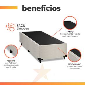 O Box é a escolha ideal para quem busca praticidade, beleza e modernidade em um só produto. Revestido com tecido reforçado e nobre e acabamento sofisticado, ele une estilo e funcionalidade. Sua estrutura é fabricada com madeira de eucalipto e pinus, materiais reconhecidos pela resistência e durabilidade. Além de garantir um visual mais elegante ao ambiente, o Box otimiza o espaço do seu quarto, tornando-o mais organizado e aconchegante. Fácil de limpar e acompanha um jogo de pés em PVC, é a combinação perfeita entre praticidade e bom gosto.