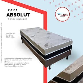 Cama Box Absolut Solteiro Ortopédica 88x188x32cm Bio Flex A Cama Box Absolut Solteiro Ortopédica 88x188x32cm Bio Flex oferece o suporte ideal para noites de sono reparadoras. Projetada com foco no conforto e na saúde da sua coluna, o modelo proporciona uma base firme para o repouso perfeito. Este produto é uma excelente escolha para quem prioriza qualidade e durabilidade. Sua estrutura robusta garante a estabilidade necessária para um descanso tranquilo, enquanto seu design discreto se adapta a diversos estilos de decoração. Invista em seu conforto e experimente a diferença de uma noite de sono em uma cama ortopédica projetada para o seu bem-estar. Em resumo, a Cama Box Absolut Solteiro Ortopédica 88x188x32cm Bio Flex representa um investimento inteligente para a qualidade do seu sono e a saúde da sua coluna. Desfrute de noites tranquilas e revigorantes com esta excelente opção para o seu quarto.\nMEDIDAS\nAltura 32 cm\nLargura 88 cm\nComprimento 188 cm\nCARACTERÍSTICAS\nFabricante Bio Flex\nModelo Cama Box Absolut Solteiro\nGarantia 3 Meses\nTipo de Produto Cama Box Solteiro\nNível de Conforto Firme\nPossui Molas Não\nEstrutura Madeira Tratada de Reflorestamento\nDensidade Espuma D33\nProteção Antiácaro, Antimofo e Antialérgico\nNúmero de Pés 04\nRevestimento Tecido de Malha no Tampo e Faixa de Suede na Lateral\nINFORMAÇÕES IMPORTANTES\nObjetos decorativos que porventura apareçam na foto, não acompanham o produto. Não nos responsabilizamos pela montagem/instalação dos produtos.\nMontagens, desmontagens e instalações são responsabilidades do cliente. Indicamos que contrate uma empresa de montagem ou um montador de sua confiança.\nAlém disso, favor verificar se os pés e acessórios estão dentro do forro inferior do produto. Em suma, todas as informações divulgadas sobre o produto são de responsabilidade do Fabricante.\nAs cores do produto podem variar de acordo com o seu monitor, a iluminação do ambiente em que você está e até mesmo a sua percepção visual. Além da cor, pequenos detalhes e acabamentos podem não ficar evidentes na foto, por isso as imagens são meramente ilustrativas.
