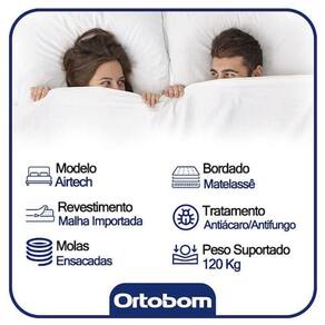 O Colchão De Molas Ensacadas AirTech Spring Ortobom é indicado para pessoas de até 120kg, o que lhe confere firmeza suficiente para preservar sua coluna durante o sono sem comprometer seu conforto.