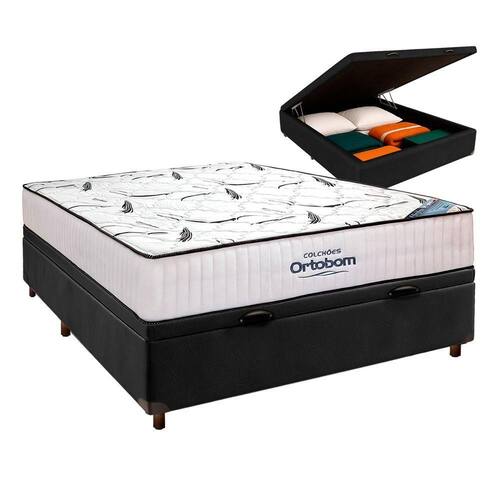 Cama Box Bau Begetiza + Colchão Casal High Foam Ortobom Conjunto Casal Colchão Hanover + Cama Box Preto + Cabeceira O Colchão High Foam Espuma HR D33 Ortobom é desenvolvido com tecido de malha de poliéster de eucalipto, tratado com aloe vera, óleo de jojoba e E proporcionando um toque macio, refrescante e um verdadeiro tratamento de beleza enquanto você dorme.