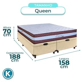 Modelo: Elite Marca: Nature Tamanho: Queen Tecido: Veludo Largura: 158cm Comprimento: 198cm Altura: 35cm Altura dos Pés: 7cm Material dos Pés: Madeira Suporte de Peso: 150Kg Peso: 40Kg Garantia: 3 Meses