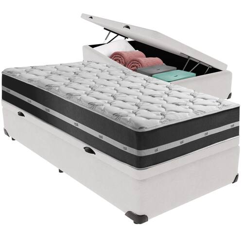 O conforto que sua casa precisa e a qualidade que você merece está na Kazamix!Descubra o Colchão Classic da Anjos, a combinação perfeita de funcionalidade, conforto e durabilidade. Com design clean e moderno, sua superfície plana proporciona um toque de elegância ao ambiente, enquanto as molas ensacadas garantem um suporte individualizado, ideal para um descanso tranquilo e sem transferência de movimento.Este modelo oferece conforto intermediário, adaptando-se às mais variadas preferências. Com tratamento antiácaro e antialérgico, o Classic cria um ambiente mais saudável e seguro para o seu sono. Um colchão de alta densidade que une qualidade e custo-benefício, perfeito para quem valoriza bem-estar e sofisticação. Transforme suas noites com o conforto que você merece!Modelo: Classic 26 PretoMarca: AnjosTamanho: SolteiroDimensões: 88x188X26 (Largura x Comprimento x Altura)Conforto: IntermediárioSistema: Molas ensacadas Pillow: Não se AplicaPeso Máximo recomendado: 130 kg (Por pessoa)Proteções: Antiácaro, antialérgico, antifungo, antimofoGarantia: 1 ano pelo FabricanteO conforto que sua casa precisa e a qualidade que você merece está na KazamixAproveite cada metro quadrado do seu dormitório com a Cama Box Baú!Projetada com madeira de reflorestamento reforçada, a Cama Box Baú é a escolha ideal para quem busca otimização de espaço e praticidade na organização do dia a dia.Com um baú generoso, ela oferece a solução perfeita para armazenar travesseiros extras, cobertores, malas e muito mais. Além disso, sua estrutura robusta suporta até 150 kg por pessoa, garantindo a sustentação ideal para o seu colchão e prolongando sua vida útil.O pistão a gás robusto proporciona uma abertura suave e segura do baú, oferecendo praticidade e resistência no uso diário. Para completar, o acabamento de alta qualidade combina perfeitamente com qualquer estilo de decoração, agregando elegância e versatilidade ao seu ambiente.Não perca tempo! Adquira agora mesmo sua Cama Box Baú e diga adeus à falta de espaço e desorganização.Marca: KazaMixModelo: BaúCor do Box: BrancoTamanho: SolteiroDimensões: 88X188X37 (Largura x Comprimento x Altura) Estrutura: MadeiraPeso máximo recomendado: 150 kg (Por Pessoa)Altura do Box: 32 cm Altura dos Pés: 5 cm Altura total: 37 cm Garantia: 03 mesesSelo Ecologicamente CorretoAtenção: Antes de finalizar sua compra, certifique-se de que as dimensões do produto sejam adequadas para serem transportadas pelos elevadores, portas, escadas e corredores de sua residência. Ressaltamos que não nos responsabilizamos pelo transporte do produto por meios específicos, como escadas, guinchos ou içamentos.