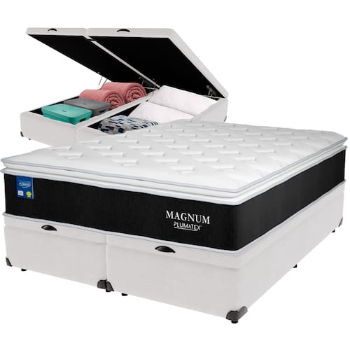 O conforto que sua casa precisa e a qualidade que você merece está na Kazamix!Descubra o colchão Magnum da Plumatex, a escolha ideal para quem busca conforto, suporte e qualidade. Com tecnologia avançada, o Magnum combina o melhor em materiais e design para proporcionar uma experiência de sono única.O colchão conta com uma camada de Malha Chronos 180 g/m², que oferece um toque macio e agradável. As Molas Ensacadas garantem suporte personalizado e distribuem o peso de forma uniforme, minimizando a transferência de movimento. A Espuma D26 oferece firmeza e conforto duradouro, enquanto o EPS Pillow Top Hig|h Tech adiciona um toque luxuoso, elevando ainda mais a experiência de descanso.Com proteção antiácaro, antialérgico e antifungo, o Magnum assegura um ambiente saudável para o seu sono. Ideal para quem deseja um colchão durável e de alta performance.Invista no seu bem-estar e experimente o conforto excepcional do Magnum.Modelo: MagnumMarca: PlumatexTamanho: QueenDimensões: 158x198X28 (Largura x Comprimento x Altura)Conforto: IntermediárioSistema: Molas EnsacadasPillow: Pillow TopPeso Máximo recomendado: 110 kg (Por pessoa)Proteções: Antiácaro, antialérgico, antifungo, antimofoGarantia: 1 ano pelo FabricanteO conforto que sua casa precisa e a qualidade que você merece está na KazamixAproveite cada metro quadrado do seu dormitório com a Cama Box Baú!Projetada com madeira de reflorestamento reforçada, a Cama Box Baú é a escolha ideal para quem busca otimização de espaço e praticidade na organização do dia a dia.Com um baú generoso, ela oferece a solução perfeita para armazenar travesseiros extras, cobertores, malas e muito mais. Além disso, sua estrutura robusta suporta até 150 kg por pessoa, garantindo a sustentação ideal para o seu colchão e prolongando sua vida útil.O pistão a gás robusto proporciona uma abertura suave e segura do baú, oferecendo praticidade e resistência no uso diário. Para completar, o acabamento de alta qualidade combina perfeitamente com qualquer estilo de decoração, agregando elegância e versatilidade ao seu ambiente.Não perca tempo! Adquira agora mesmo sua Cama Box Baú e diga adeus à falta de espaço e desorganização.Marca: KazaMixModelo: BaúCor do Box: BrancoTamanho: QueenDimensões: 158X198X37 (Largura x Comprimento x Altura) Estrutura: MadeiraPeso máximo recomendado: 150 kg (Por Pessoa)Altura do Box: 32 cm Altura dos Pés: 5 cm Altura total: 37 cm Garantia: 03 mesesSelo Ecologicamente CorretoAtenção: Antes de finalizar sua compra, certifique-se de que as dimensões do produto sejam adequadas para serem transportadas pelos elevadores, portas, escadas e corredores de sua residência. Ressaltamos que não nos responsabilizamos pelo transporte do produto por meios específicos, como escadas, guinchos ou içamentos.