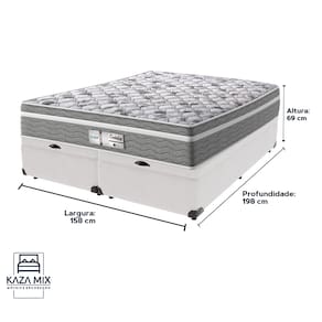 Bem-vindo(a) ao nosso catálogo!Apresentamos a você uma descrição completa sobre esse produto:Primeira marca a fabricar colchões em escala industrial no Brasil, a Probel sempre apresentou novidades ao mercado. Entre elas, estão os sistemas exclusivos de molejo Multilastic e de espumação Uniblock.Modelo: EvolutionNível de Conforto: Intermediário Suporte de peso: 240 quilos (120 kg por pessoa)Molas: Molas EnsacadasPillow: EuropillowEspuma: D28Altura: 32 cmTecido:Bordado em MatelassêTransforme suas noites com o Colchão Evolution, onde tecnologia e conforto se encontram para proporcionar o descanso perfeito. Com molas ensacadas e espuma de densidade D28, ele oferece o suporte ideal para alinhar sua coluna e aliviar pontos de pressão, garantindo um sono reparador e sem interrupções.O acabamento em poliéster diamante traz um toque de luxo, enquanto o pillow euro adiciona uma camada extra de conforto, fazendo você se sentir em um verdadeiro abraço a cada noite. Além disso, o tratamento antiácaro e antialérgico promove um ambiente mais saudável, ideal para quem busca bem-estar e saúde no seu descanso.Com suporte de peso de até 120 kg por pessoa, o Evolution é robusto e durável, feito para acompanhar você por muitos anos. Não perca a chance de transformar suas noites com o Colchão Evolution e sinta a diferença de um sono verdadeiramente revitalizante!Além de tudo, esse produto acompanha a Cama Box com Baú da Kaza Mix e assim se torna um conjunto perfeito para o seu quarto!Marca: Kaza MixCor do Baú: BrancoTamanho: QueenMaterial dos pés: MadeiraEstrutura: MadeiraPeso máximo recomendado: Até 150kg de cada ladoAbertura: Pistão a gásLargura: 158cmComprimento: 198cmAltura total: 42cmAltura interna Baú: 27cmAltura dos pés: 6cmGarantia: 03 mesesSelo Ecologicamente CorretoAtenção: - Antes de finalizar sua compra, recomendamos que verifique se as dimensões do produto são adequadas para serem transportadas pelos elevadores, portas, escadas e corredores de sua residência. Ressaltamos que não nos responsabilizamos pelo transporte do produto por meios específicos, como escadas, guinchos ou içamentos.- É possível que hajam leves variações de cor de acordo com o dispositivo que está sendo utilizado como smartphones, computadores, monitores e outros.