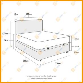 Especificações Técnicas Baú: - Marca: Lucas Home; - Material: Madeira tratada; - Peso máximo recomendado: até 150 Kg (por pessoa); - Altura do baú: 37cm; - Profundidade do baú: 25cm; - Altura dos pés: 5cm; - Revestimento da Cama: Material Sintético; - Garantia: 6 meses de garantia; - Dimensões do produto (largura x comprimento x altura) Casal: 138x188x42cm.