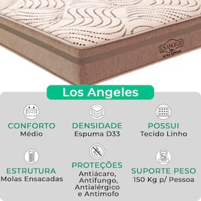 A tecnologia que a sua casa merece está na V-Store! O Conjunto Colchão Los Angeles + Base Box Baú Bravus da V-Store oferece conforto e funcionalidade. O colchão, com molas ensacadas e sistema EPS, garante suporte ideal, conforto térmico e proteção antiácaro. A base box, com amplo espaço de armazenamento, é feita de madeira reflorestada e revestida com tecido resistente, proporcionando praticidade e sofisticação ao seu quarto.Característica Do Colchão: Modelo: Los AngelesMarca: V-StoreTamanho: CasalDimensões: 138x28x188 (Largura x Altura x Comprimento)Conforto: MédioSistema: Molas EnsacadasPillow: Não se aplicaPeso Máximo recomendado: 150 kg (Por pessoa)Proteções: Antiácaro, antialérgico, antifungo, antimofoGarantia: 12 Meses (Espuma) / 10 anos ( Conjunto de Molas Ensacadas)Característica Da Base: Marca: V-StoreModelo: BravusCor do Box: BegeTamanho: CasalDimensões: 138x44x188 (Largura x Altura x Comprimento)Estrutura: MadeiraPeso máximo recomendado: 150 kg (Por Pessoa)Altura do Box: 38 cmAltura dos Pés: 6 cmAltura total: 44 cmGarantia: 12 Meses (Estrutura) / 3 meses (Tecido)Selo Ecologicamente CorretoAtenção:- Antes de finalizar sua compra, recomendamos que verifique se as dimensões do produto são adequadas para serem transportadas pelos elevadores, portas, escadas e corredores de sua residência. Ressaltamos que não nos responsabilizamos pelo transporte do produto por meios específicos, como escadas, guinchos ou içamentos.- É possível que hajam leves variações de cor de acordo com o dispositivo que está sendo utilizado como smartphones, computadores, monitores e outros.