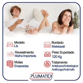 Cama Box Baú Casal Bipartido Suede + Colchão Lis Molas Ensacadas Plumatex 138x188x64cm É revestido em Bambú Fresh em Malha de Poliéster com Viscose que oferece um toque muito mais refrescante e confortável, sua lateral é em Camurça. Tem sua estrutura em molas ensacadas individualmente, que reduzem a vibração ao longo de sua superfície, garantindo mais conforto e perfeita acomodação, além de permitir que uma pessoa se movimente sem incomodar quem está ao lado. Possui Ortopillow com camada extra de conforto e bordado em matelassê, que maximiza a sensação de maciez. Conta com respiros laterais que permite uma maior ventilação no Colchão, evitando a proliferação de ácaros, bactérias e fungos, recebe tratamento antialérgico e antiácaro, preocupação extra com sua saúde. Devido a tecnologia No Turn, não precisa ser virado. Características do Colchão: - Marca: Plumatex - Modelo: Lis - Tamanho: Casal - Estrutura Interna: Molas Ensacadas, manta de espuma D26 de Alta Performance, Ortopillow. - Estrutura externa: Tecido em Bambú Fresh em Malha de Poliéster com Viscose de alta resistência e maciez, lateral em Camurça, bordado em Matelassê, manta de espuma D26 Pró Aditivada.. - Nível de Conforto: Firme - Altura: 24cm - Largura x Profundidade: 138x188cm - Peso: 37kg - Acompanha: 1 Colchão Plumatex + Manual - Este produto possui 1 volume - Proteção: Antialérgico, Antiácaro, Antifungo, Antimofo - Peso Suportado por Pessoa: 120kg - Dimensões do Produto: Largura: 138cm Altura: 24cm Profundidade: 188cm Características do Box Baú: - Marca: Home Queen - Estrutura Interna: Estrutura em madeira 100% de Reflorestamento - Estrutura Externa: Suede - Tratamento Antiácaro: Sim - Tratamento Antialérgico: Sim - Saída de Ventilação: Não - Ortopédico: Não - Tecido Antiderrapante: Não - Suporta até (kg): 150 Kg - Necessita Montagem: Não - Dimensões do box (largura x comprimento x altura): 138x188x40cm Dimensões do Produto: - Altura (Box + Colchão): 64cm - Largura: 138cm - Comprimento: 188cm - Altura dos Pés: 12cm *As cores do produto podem variar de acordo com o monitor, a iluminação do ambiente e a sua percepção visual.* *Confira as dimensões do produto e certifique-se de que passará normalmente por supostos elevadores, portas, escadas e/ou corredores de sua residência.* *Verifique nossas politicas internas para que não haja nenhuma dúvida no processo de entrega ao finalizar a compra, pois não fazemos a montagem e desmontagem do produto e/ou portas e janelas, transporte pela escada ou içamento pelo lado de fora do prédio.*