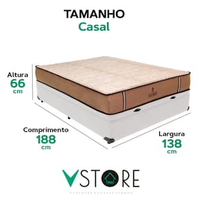 A tecnologia que a sua casa merece está na V-Store! O Conjunto Colchão Madrid + Base Box Baú Bravus da V-Store oferece o equilíbrio perfeito entre conforto, praticidade e elegância. O colchão, com molas ensacadas e sistema EPS, garante noites de sono tranquilas, com suporte ideal e proteção contra ácaros e alergias. Já a base box baú, feita com madeira reflorestada, conta com um design sofisticado, amplo espaço de armazenamento e funcionalidade adicional para guardar travesseiros, malas e cobertores. Com capacidade para até 150 kg por pessoa, esse conjunto é ideal para quem busca qualidade e praticidade.Característica Do Colchão: Modelo: MadridMarca: V-StoreTamanho: CasalDimensões: 138x28x188 (Largura x Altura x Comprimento)Conforto: MédioSistema: Molas EnsacadasPillow: Não se aplicaPeso Máximo recomendado: 150 kg (Por pessoa)Proteções: Antiácaro, antialérgico, antifungo, antimofoGarantia: 12 Meses (Espuma) / 10 anos ( Conjunto de Molas Ensacadas)Característica Da Base: Marca: V-StoreModelo: BravusCor do Box: BrancoTamanho: CasalDimensões: 138x44x188 (Largura x Altura x Comprimento)Estrutura: MadeiraPeso máximo recomendado: 150 kg (Por Pessoa)Altura do Box: 38 cmAltura dos Pés: 6 cmAltura total: 44 cmGarantia: 12 Meses (Estrutura) / 3 meses (Tecido)Selo Ecologicamente CorretoAtenção:- Antes de finalizar sua compra, recomendamos que verifique se as dimensões do produto são adequadas para serem transportadas pelos elevadores, portas, escadas e corredores de sua residência. Ressaltamos que não nos responsabilizamos pelo transporte do produto por meios específicos, como escadas, guinchos ou içamentos.- É possível que hajam leves variações de cor de acordo com o dispositivo que está sendo utilizado como smartphones, computadores, monitores e outros.
