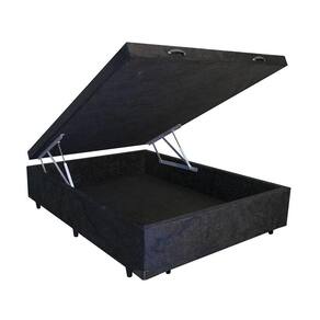 Base Cama Box Baú Casal fabricada com madeira reforçada 100% de reflorestamento, acabamento em tecido Suede, tratamento antialérgico e antiácaro, pés em madeira, estrutura recomendada para até 130kg.