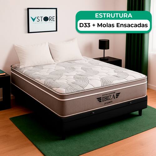 A tecnologia que a sua casa merece está na V-Store! O colchão Ibiza combina Molas Ensacadas, espuma de alta performance e sistema EPS, oferecendo suporte, conforto térmico e design moderno para noites revigorantes. Já a Base Box Baú Bravus une funcionalidade e elegância, com estrutura resistente, revestimento em tecido sintético e amplo espaço para armazenamento, ideal para otimizar o quarto com estilo..Característica Do Colchão: Modelo: IbizaMarca: V-StoreTamanho: CasalDimensões: 138x22x188 (Largura x Altura x Comprimento)Conforto: intermediárioSistema: Molas EnsacadasPillow: Não se aplicaPeso Máximo recomendado: 150 kg (Por pessoa)Proteções: Antiácaro, antialérgico, antifungo, antimofoGarantia: 12 Meses (Espuma) / 10 anos ( Conjunto de Molas Ensacadas)Característica Da Base: Marca: V-StoreModelo: BravusTamanho: CasalDimensões: 138x44x188 (Largura x Altura x Comprimento)Estrutura: MadeiraPeso máximo recomendado: 150 kg (Por Pessoa)Altura do Box: 38 cmAltura dos Pés: 6 cmAltura total: 44 cmGarantia: 12 Meses (Estrutura) / 3 meses (Tecido)Selo Ecologicamente CorretoAtenção:- Antes de finalizar sua compra, recomendamos que verifique se as dimensões do produto são adequadas para serem transportadas pelos elevadores, portas, escadas e corredores de sua residência. Ressaltamos que não nos responsabilizamos pelo transporte do produto por meios específicos, como escadas, guinchos ou içamentos.- É possível que hajam leves variações de cor de acordo com o dispositivo que está sendo utilizado como smartphones, computadores, monitores e outros.