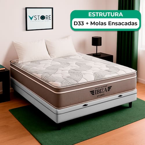 A tecnologia que a sua casa merece está na V-Store! O colchão Ibiza combina Molas Ensacadas, espuma de alta performance e sistema EPS, oferecendo suporte, conforto térmico e design moderno para noites revigorantes. Já a Base Box Baú Bravus une funcionalidade e elegância, com estrutura resistente, revestimento em tecido sintético e amplo espaço para armazenamento, ideal para otimizar o quarto com estilo..Característica Do Colchão: Modelo: IbizaMarca: V-StoreTamanho: CasalDimensões: 138x22x188 (Largura x Altura x Comprimento)Conforto: intermediárioSistema: Molas EnsacadasPillow: Não se aplicaPeso Máximo recomendado: 150 kg (Por pessoa)Proteções: Antiácaro, antialérgico, antifungo, antimofoGarantia: 12 Meses (Espuma) / 10 anos ( Conjunto de Molas Ensacadas)Característica Da Base: Marca: V-StoreModelo: BravusTamanho: CasalDimensões: 138x44x188 (Largura x Altura x Comprimento)Estrutura: MadeiraPeso máximo recomendado: 150 kg (Por Pessoa)Altura do Box: 38 cmAltura dos Pés: 6 cmAltura total: 44 cmGarantia: 12 Meses (Estrutura) / 3 meses (Tecido)Selo Ecologicamente CorretoAtenção:- Antes de finalizar sua compra, recomendamos que verifique se as dimensões do produto são adequadas para serem transportadas pelos elevadores, portas, escadas e corredores de sua residência. Ressaltamos que não nos responsabilizamos pelo transporte do produto por meios específicos, como escadas, guinchos ou içamentos.- É possível que hajam leves variações de cor de acordo com o dispositivo que está sendo utilizado como smartphones, computadores, monitores e outros.